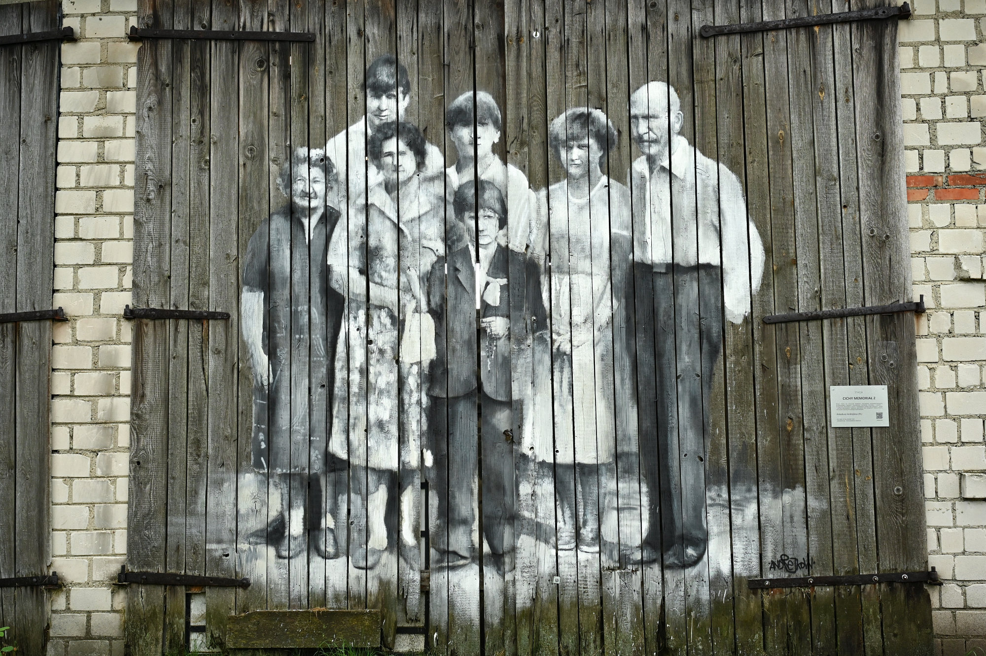 Mural, zwany też potocznie deskalem, inspirowany archiwalną fotografią, przedstawiającą dawnych mieszkańców: Bernadetę Jarzyńską z dziećmi - Grzegorzem, Krzysztofem, Joanną i najmłodszym Jackiem oraz rodzicami - Józefą i Józefem Wiśniewskimi. Realizacja upamiętnia ludzi związanych lokalną historią, ale zarazem nieznanych w zasięgu ogólnopolskim.