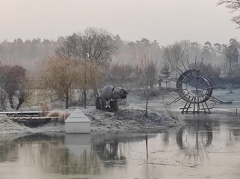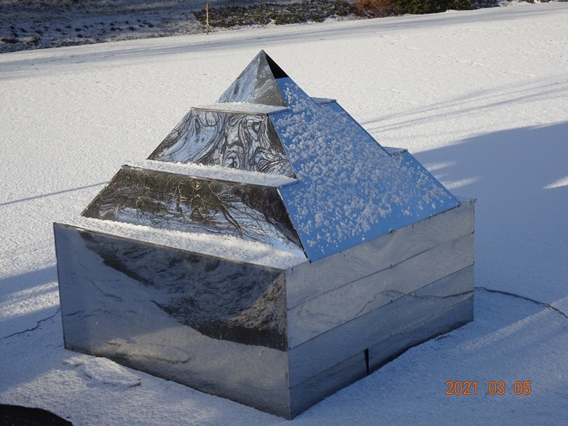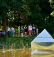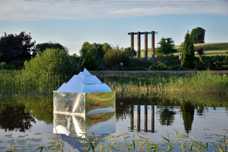 Piramida oscylująca pomiędzy obiektem, klepsydrą a konceptualnym lustrem na wodzie (in spe). Z założenia ma łączyć energię kierunków, odbijając jednocześnie balast nieba. Lustrzane odbicie ogrodu ziemskiego będzie spływało po bocznych ścianach obiektu, w prostopadłych schodach piramidy niebo będzie zostawiało skan eteru. Mobilność obiektu wodnego poruszy stojąca dotychczas, beztroska woda stawu.