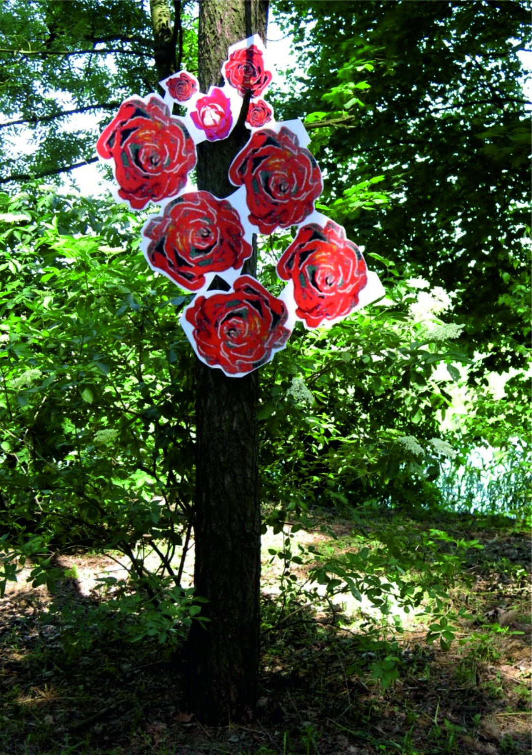 Instalacja graficzna Ryszarda Grazdy. Droga Róż łączy się w sposób naturalny z mieszkaniem myśliwego, tworząc jakoby spójny rodowód kultury łowiecko-zbierackiej i uprawy zbóż. Róża to symbol miłości i nie tylko, atrybut trwania. Krzew, który jednocześnie był uprawiany w strefie Żyznego półksiężyca (gdzie narodziły się pierwsze ogrody w Chinach - skąd pochodzi). Kwiat jest wieloznacznikiem symbolicznym w chrześcijaństwie. Wydruki graficzne Grazdy, zatopione w poliwęglanie tworzyły postawę paraekologiczną. Królowa kwiatów witała gości w swojej leśnej galerii jednocześnie była zamknięta w przestrzeni określonej przez wymiar plexi.
