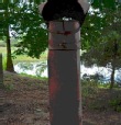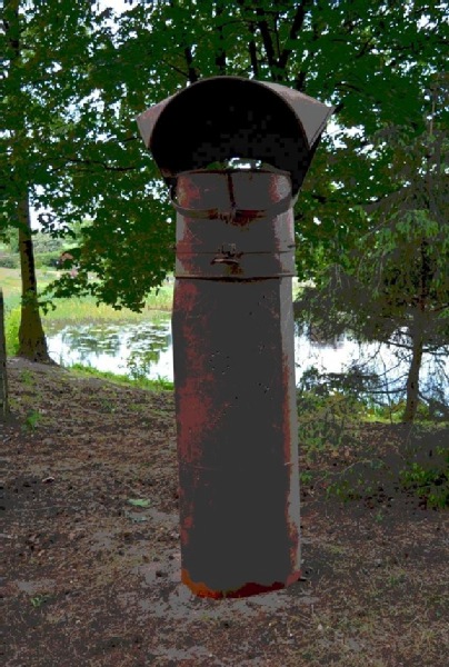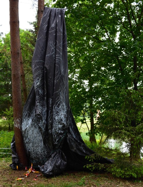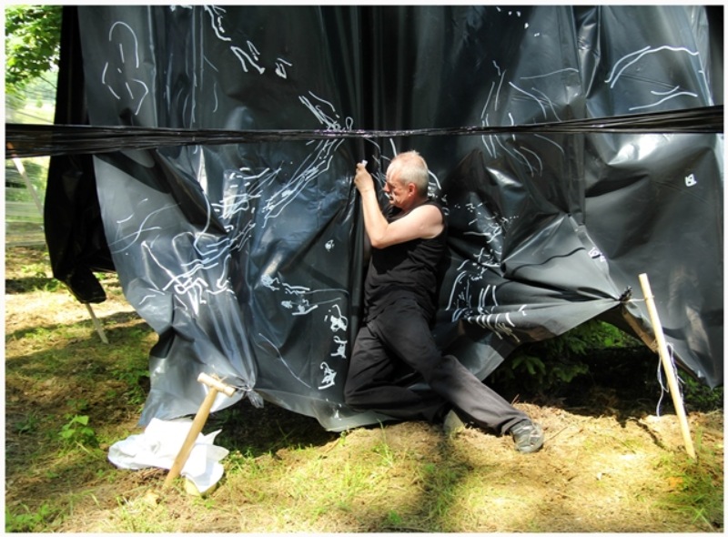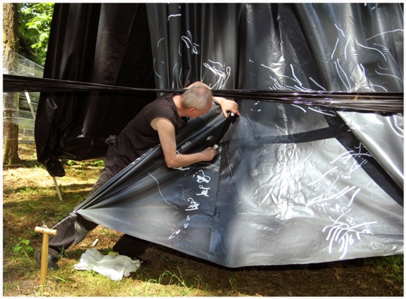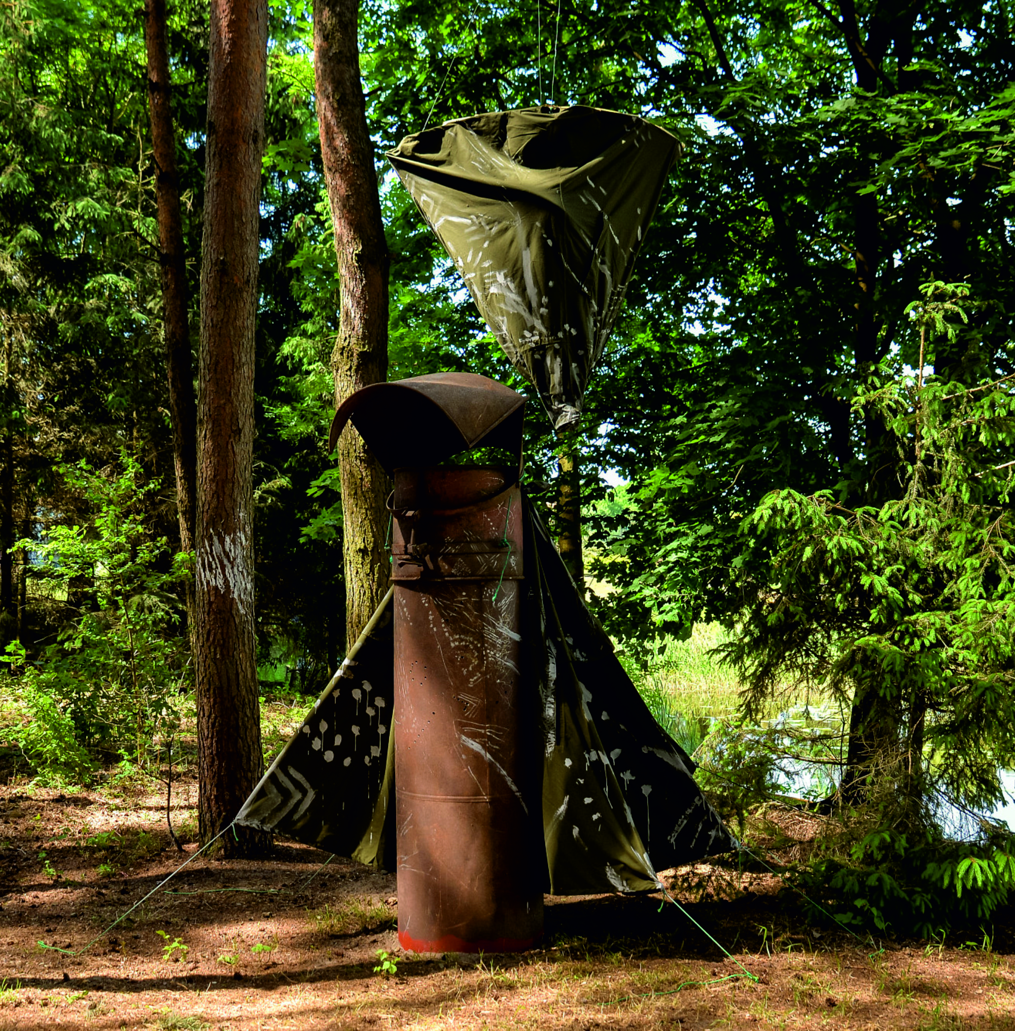 Szałas człowieka jaskiniowego. Pierwotnie z rysunkiem na folii (czarna folia budowlana). Najnowsza wersja z roku 2018 to wykorzystanie starych rur stalowych z gospodarstwa w Szumiłowie z namiotami (pałatkami) wojskowymi. Rysunek entoptyczny pojawił się na stali i na powierzchniach płótna namiotowego.