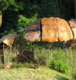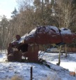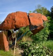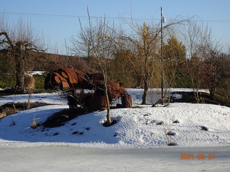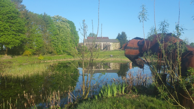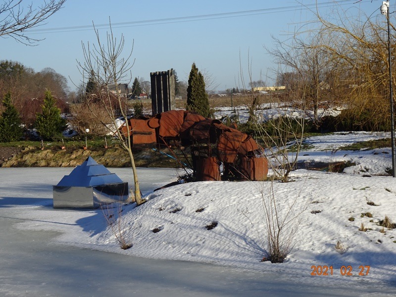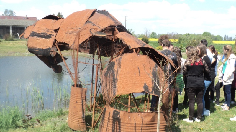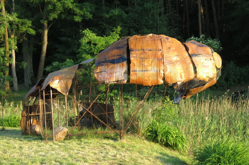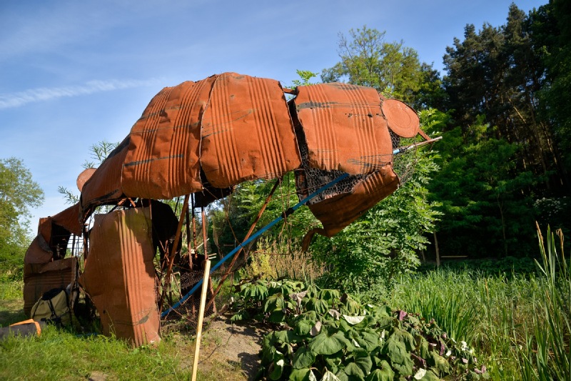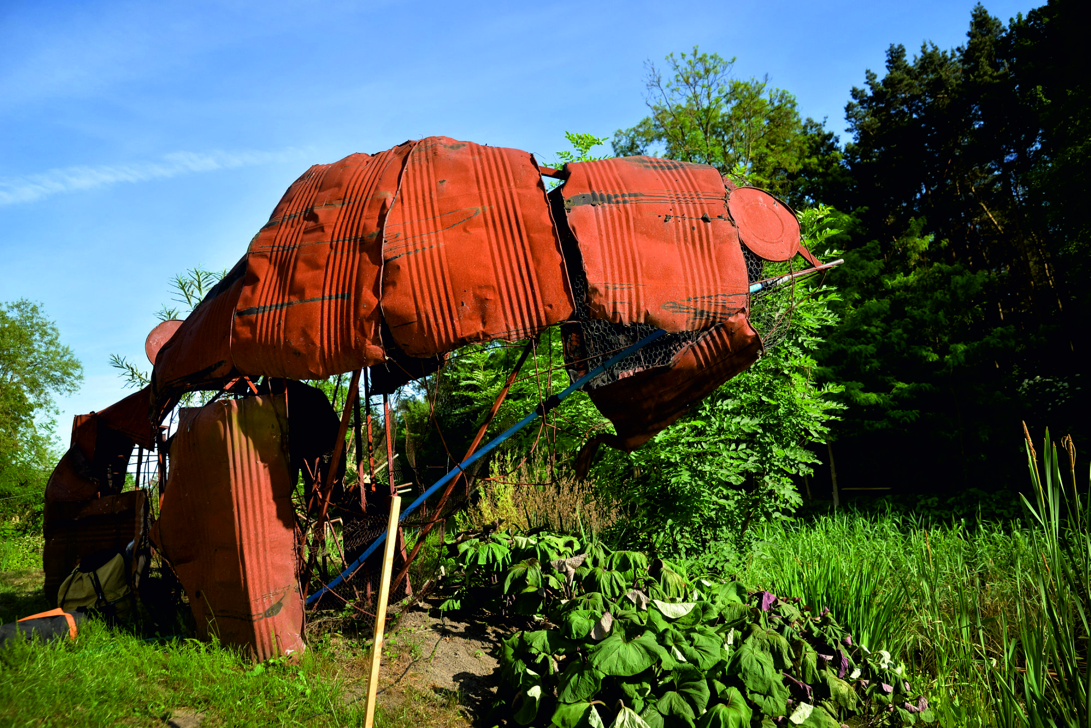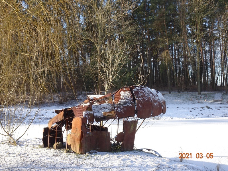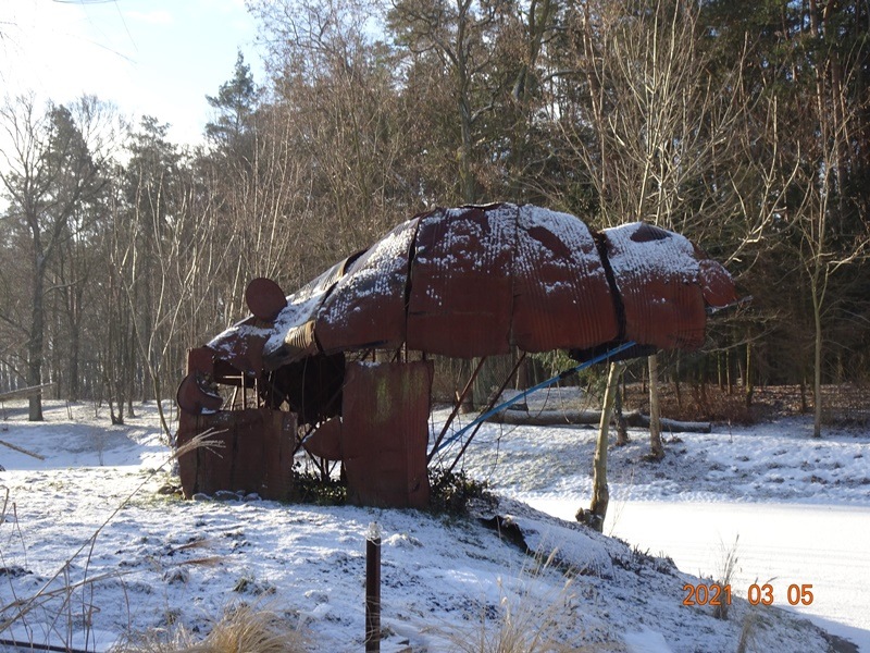 Obiekt zbudowany z kątowników i prętów stalowych. Pospawany według projektu, który zakładał zbudowanie całego zwierzaka z czarnej stali - stali odpadowej, około ekologicznej. Obiekt realizowany w konstrukcji przestrzennej z założeniem użycia owoców lasu do wypełnienia obiektu. Przedstawiciel organizmów cudzożywnych w postaci abstrakcyjnego gada stanowi dla projektodawcy - symbol utraconego świata - raju przeszłości - zagrożenia przyszłości? Bestia, która wypija wodę ze stawu Grzegorza Jarzyńskiego ma gust, bo dobra woda i sąsiedztwo przyrody akuratne, ale co będzie potem? Ślad glikogenu?